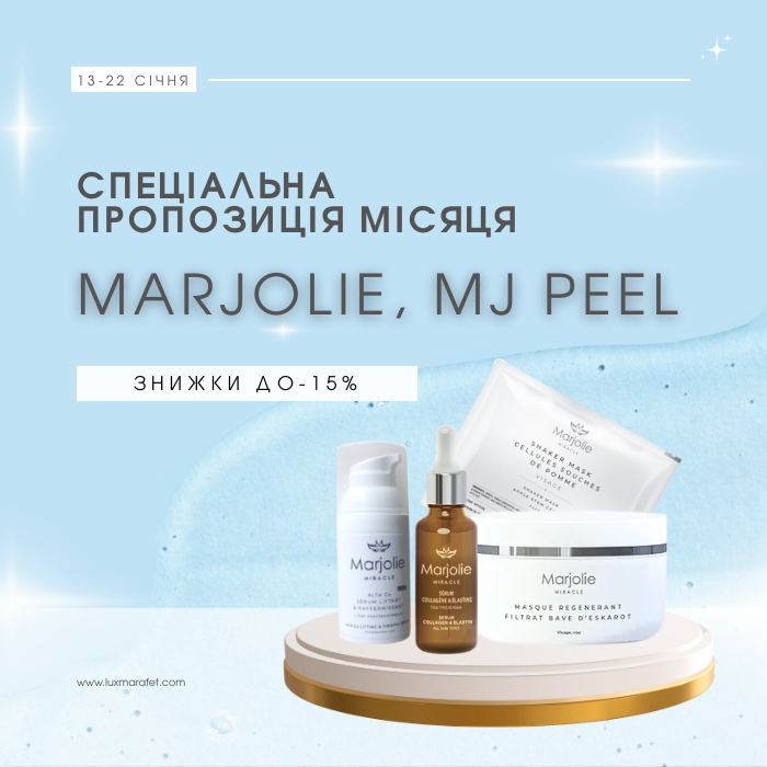Засоби Marjolie та Mj Peel обирають косметологи й клієнти, які цінують результат, безпеку та професійний підхід. Знижки діють обмежений час, тому це чудова можливість придбати перевірені продукти за привабливішою ціною та вивести догляд за шкірою на новий рівень.