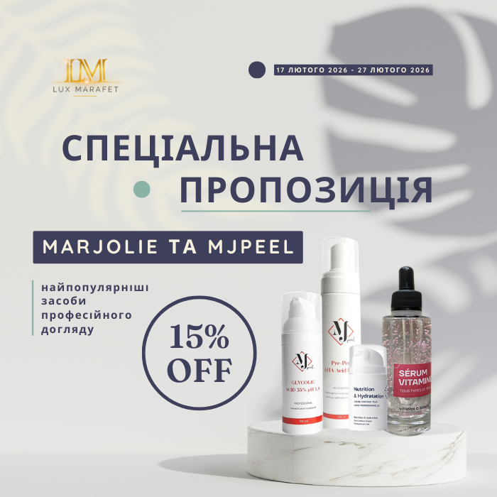 Лише до 27 лютого ви можете скористатися унікальними пропозиціями на доглядові засоби преміум-класу. Marjolie та MjPeel підготували для вас найкращі продукти для краси та здоров’я шкіри з вигідними знижками до -15%.