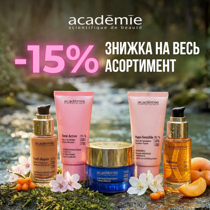 Весняна акція діє до кінця березня. При покупці будь-яких двох засобів Academie — знижка 15%. Ідеальний момент оновити догляд і спробувати новинки.