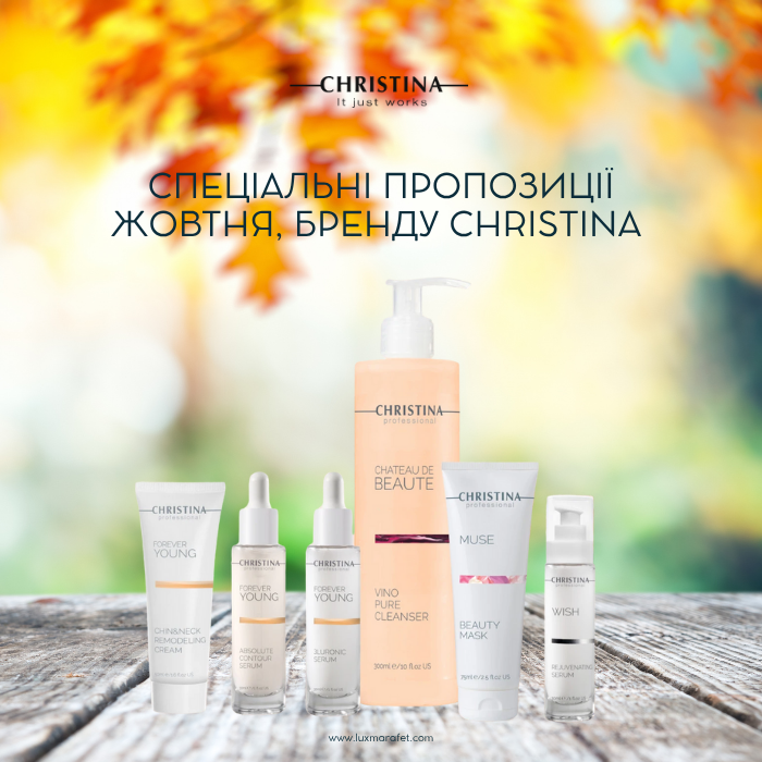 Зустрічайте ексклюзивні осінні пропозиції від Christina — час оновити догляд та порадувати себе ефективними засобами, які дарують шкірі здоров’я, свіжість та сяйво. Професійні формули, продумані поєднання та приємні подарунки — усе, щоб зробити ваш щоденний догляд особливим.