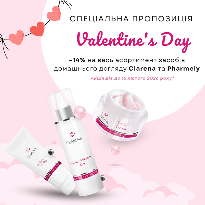 Поспішайте скористатися знижкою 14% на Clarena та Pharmely! Пропозиція діє лише до 15.02 — до Дня Святого Валентина.