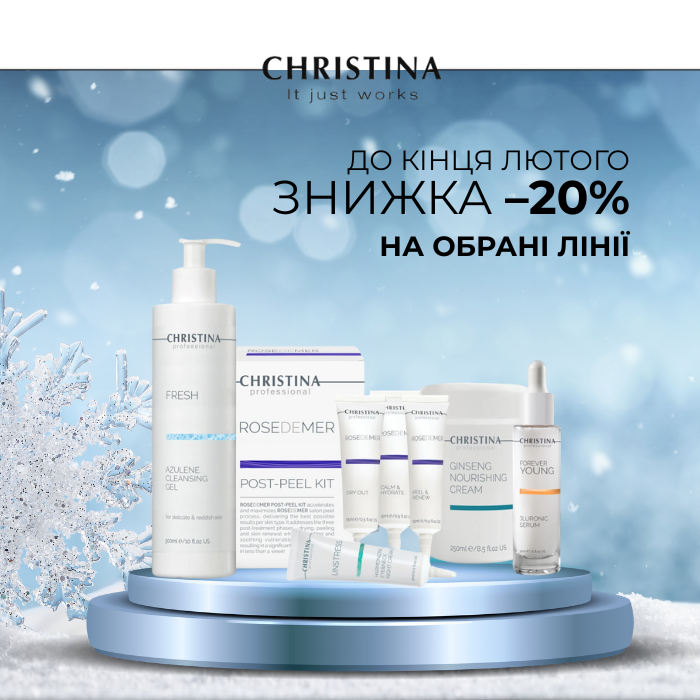 Знижка 20% діє до кінця лютого та поширюється на одні з найпопулярніших ліній Christina. Це вигідна можливість придбати професійний догляд для домашнього використання або поповнити асортимент для роботи з клієнтами. Якість, перевірена косметологами в усьому світі, стає ще доступнішою.